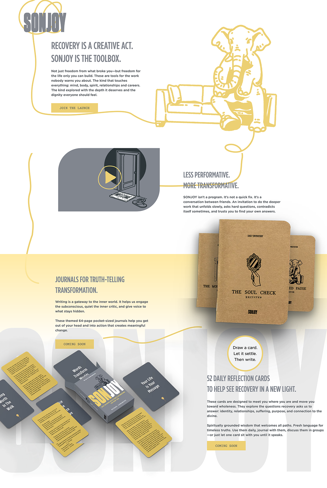 After nearly two decades of building brands for others, I founded SONJOY—a recovery brand designed to bring depth, dignity, and wholeness to a space often shaped by stigma and simplification. I developed the brand end-to-end, including 52-card decks, journaling frameworks, packaging, original illustration, curated audio experiences, and video content. The work balances accessibility with philosophical rigor, intentionally avoiding both clinical detachment and dogma, and treating recovery as a complex, human process rather than a problem to be solved.